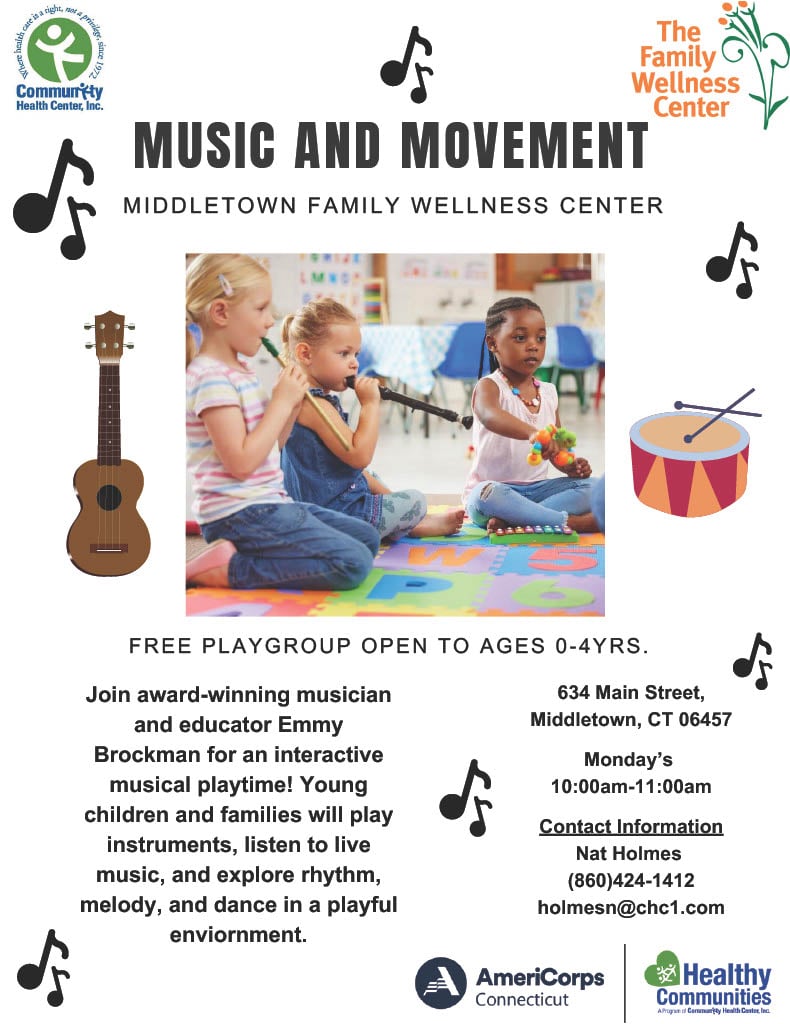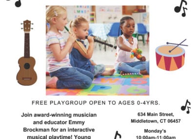 Music and Movement (634 Main Street) – (Every Monday 10 – 11 am) Interactive musical playtime! Young children and families will play instruments, listen to live music, and explore rhythm, melody, and dance in a playful environment. Each class will feature original and classic children’s songs and lots of opportunities to join in the fun! – Emmy Brockman