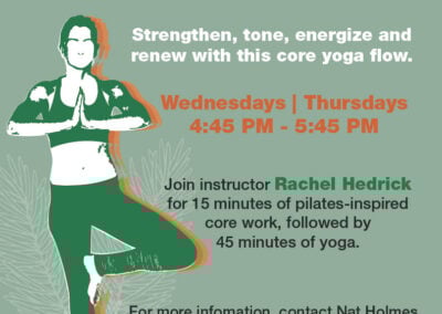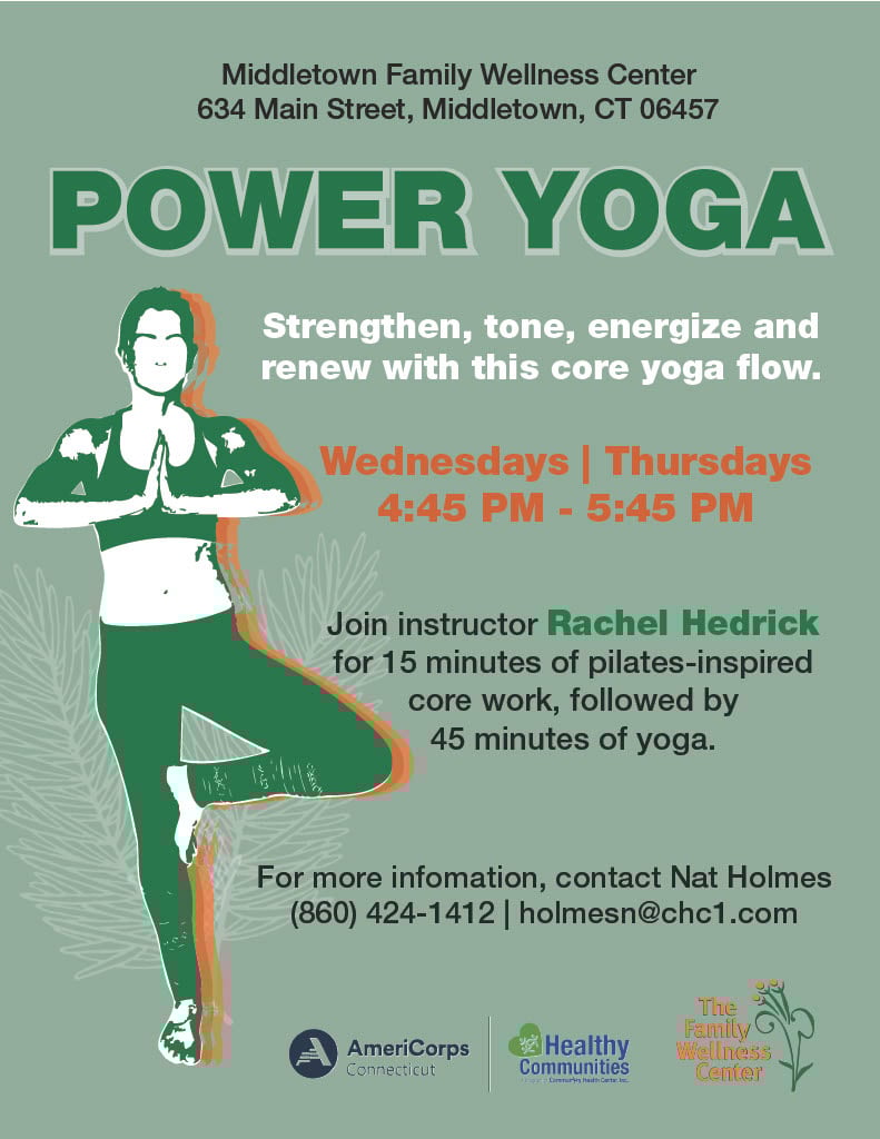 Power Yoga –– (Wednesday and Thursday – 4:45 – 5:45 pm) (634 Main Street) Power Yoga is a full body workout. It incorporates breath work, stretching and strengthening for a balanced, lean and integrated body. All levels, age 13 and up are welcome! Rachel Hedrick