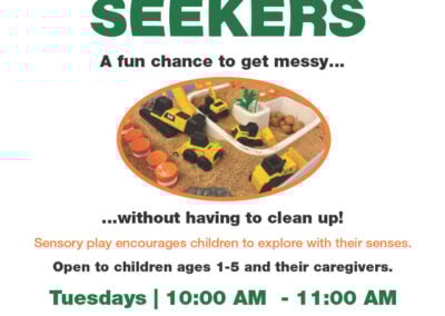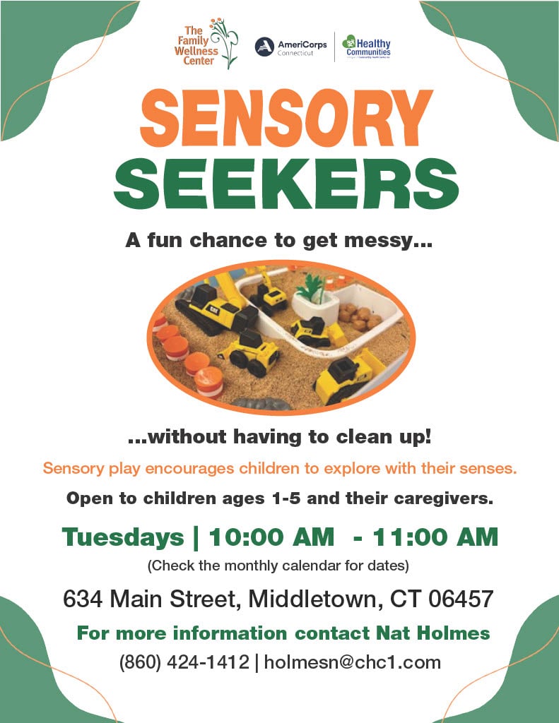 Sensory Seekers - Thursday's 10:00 - 11:00am, two dates a month -- (check calendar) - Sensory Play encourages children to explore their senses. A fun chance to get messy without having to clean up! Open to ages 1-5 - Alyssa Bruneau